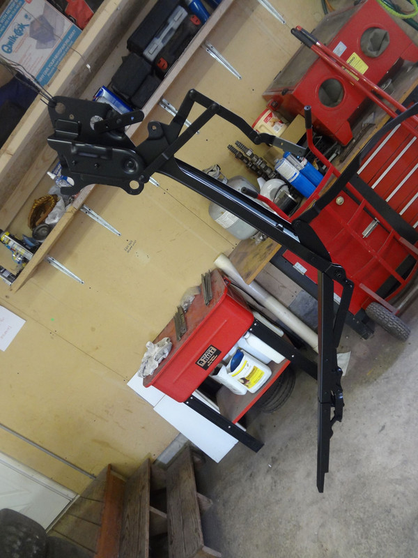 Then I hung the header panel on the garage door track and sprayed it with self etch primer and SEM Trim Black.  Then I repeated the steps with the side mechanisms.(EvapoRust bath/paint stripping wheel/hand sanding tight areas around all the links/painting with SEM)