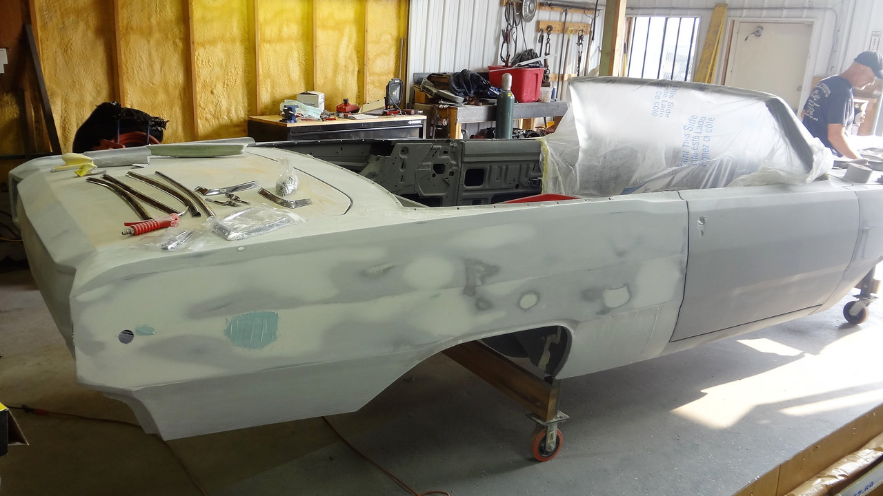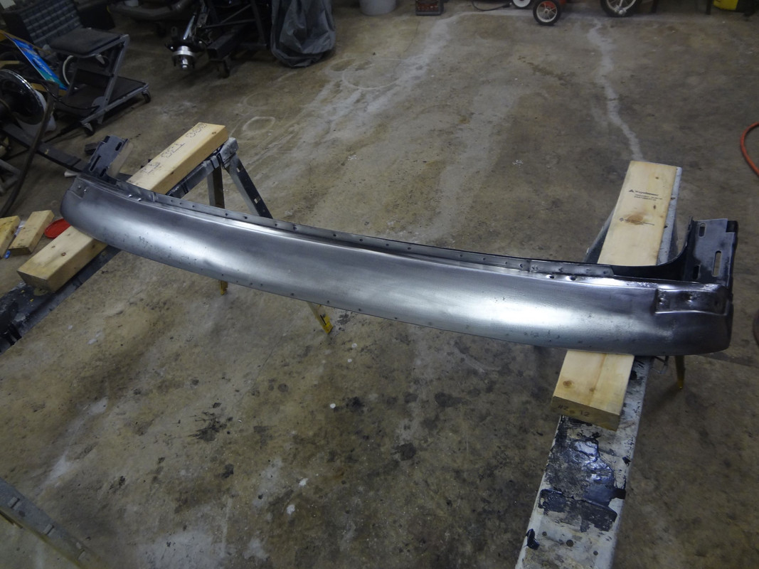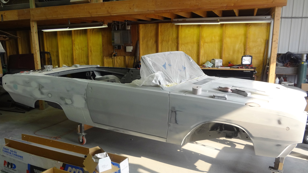 Car is starting to coming along nicely.  They have the door gaps much nicer and are well on their way to getting it straight.  Should be put on the rotisserie to work on the botton side in a couple weeks.  I dropped off the bumpers/brackets and the stainless trim that goes around the back opening for them to test fit.
