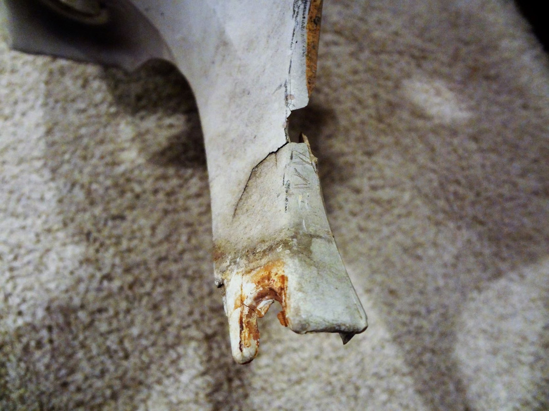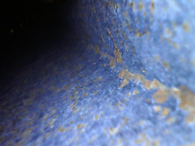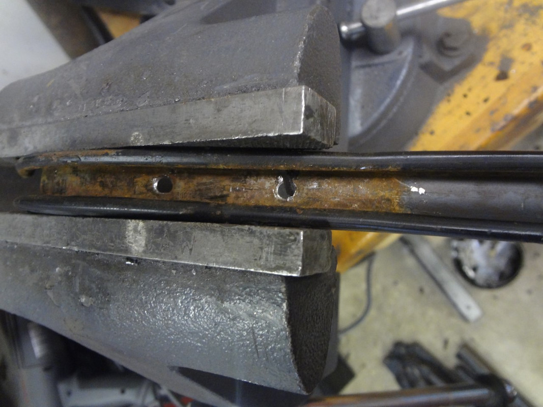 After the three bows were sanded down and painted, I turned my attention to the front header.  It looked like it was in really good shape with no sections rusted through.  After taking out the old latches though, a bunch of scaly rusty crap came out of the hollow inner cavity.  I bought a cheap endoscope for my cell phone so I could see deeper inside to assess the rust.  It looked pretty nasty.