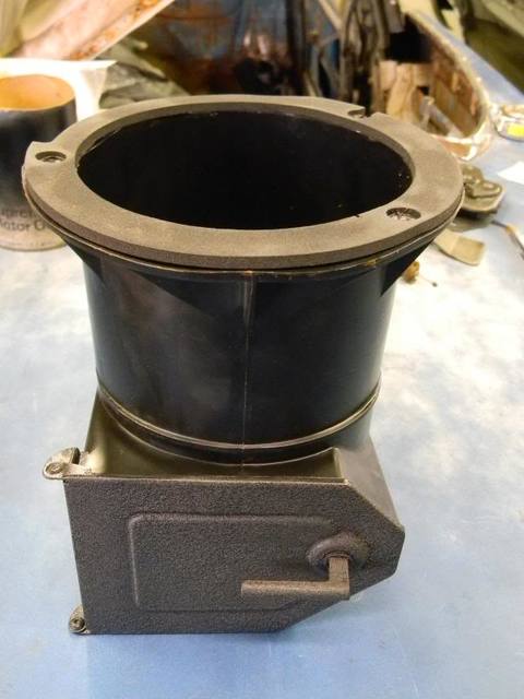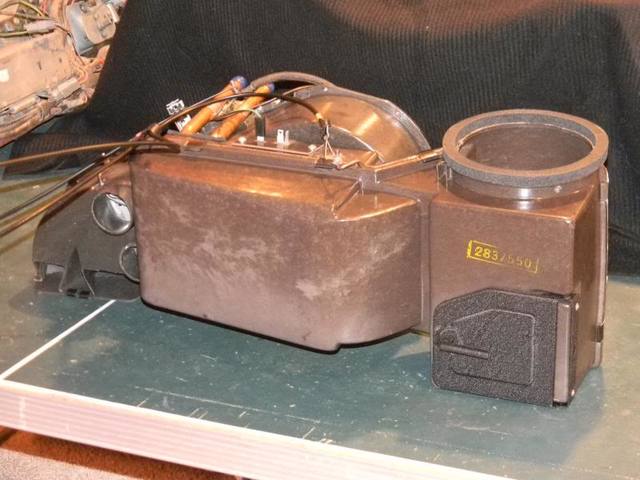 Here are some pictures of the heater box. It was pretty grungy like the rest of the interior.  The air door hinge was rusted solid.  Someone had tried opening it and cracked the heater box where it attaches. To fix the door I added a metal reinforcement on the inside and added and extra rivet in the center of the hinge.