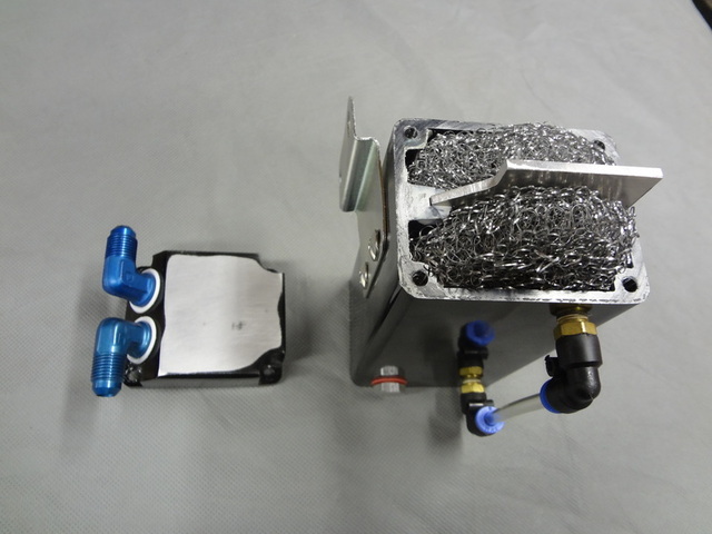 Now the PCV gases have to go through two layers of stainless mesh to get out of the can.  This should do a better job of filtering out any oil than an empty hollow can.  I didn't want a bunch of rubber hose in the engine compartment so I made lines out of aluminum tubing and connected everything together with 6AN fittings.  I'll post some pictures of how that is routed later.