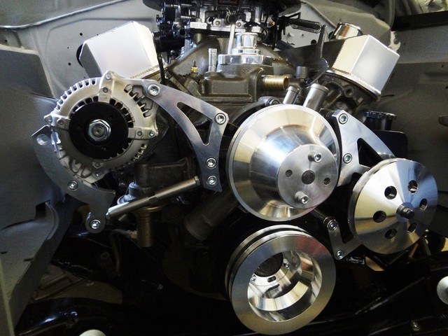 My most recent project was dealing with the alternator pulley.  I'm going to be running a 65 amp Denso off of a Toyota.  All of my other pulleys are aluminum but no one makes an aluminum pulley with a cover for the Denso.  The stock pulley with exposed attaching nut was very ugly compared to the others.