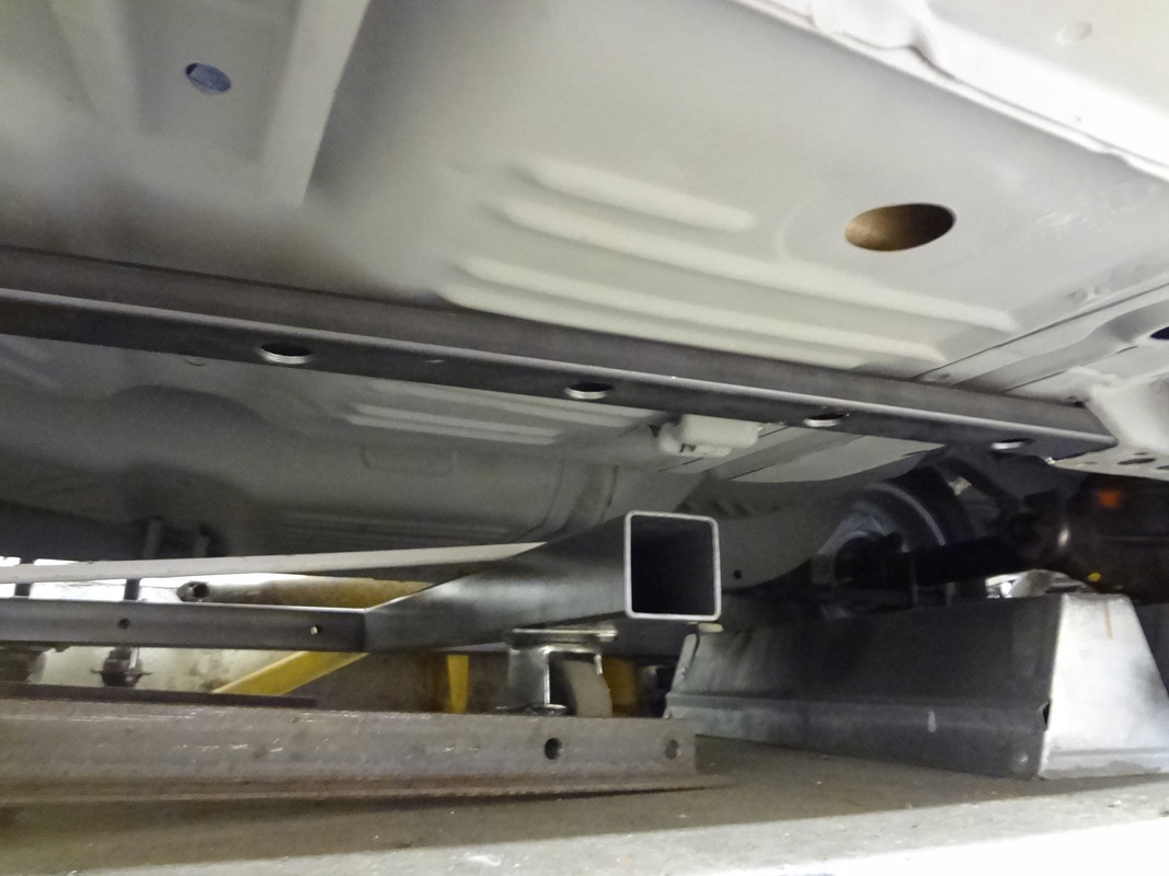 Last fall I started making frame connectors like the ones Brad made for his car.  I got the holes drilled in the tubing and the round stock cut that gets welded inside.  I also got the torsion bar x-member and rear frame rail cut and the connectors slid inside for test fitting.  Nothing is welded yet.