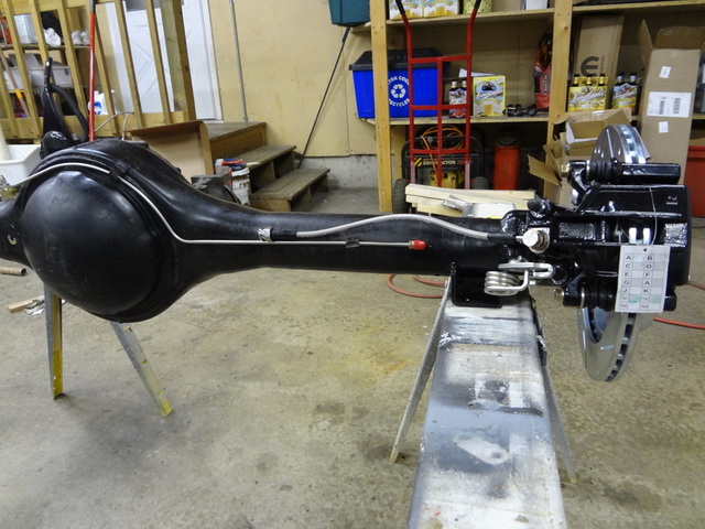 The brakes are Mustang Cobra from Dr Diff.  I had a C-body 8 3/4 shortened locally and bought axles from Dr Diff as well.  It looks like the pinion angle is going to be way off.  I'll most likely have to have new perches welded on once the car is on the ground/assembled and a final ride height determined.